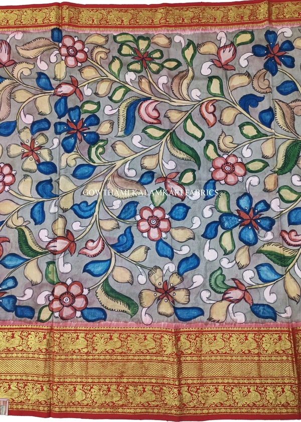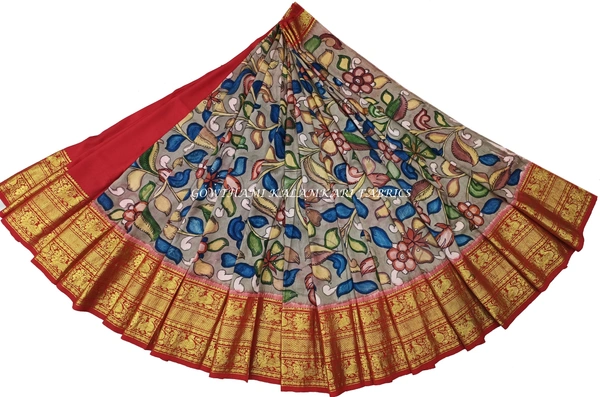 THE REAL FLORAL HAND PAINTED PEN KALAMKARI WITH KANCHI BORDER PURE PATTU DOUBLE WARP LEHENGA.
