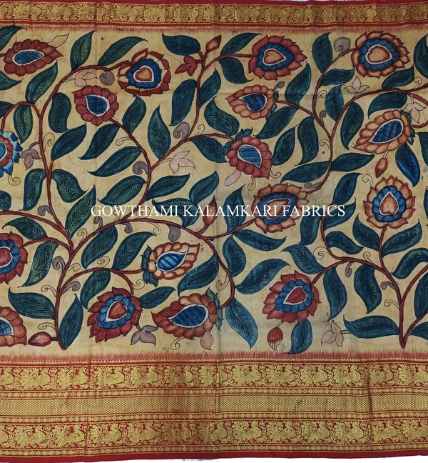 THE REAL FLORAL HAND PAINTED PEN KALAMKARI WITH KANCHI BORDER PURE PATTU DOUBLE WARP LEHENGA.