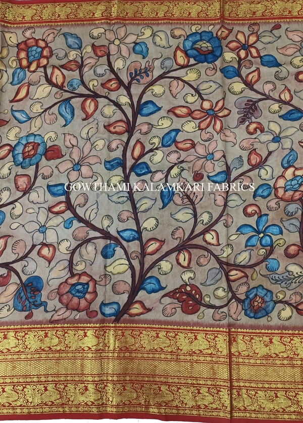 THE REAL FLORAL HAND PAINTED PEN KALAMKARI WITH KANCHI BORDER PURE PATTU DOUBLE WARP LEHENGA.