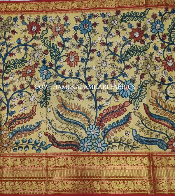 THE REAL FLORAL HAND PAINTED PEN KALAMKARI WITH KANCHI BORDER PURE PATTU DOUBLE WARP LEHENGA.