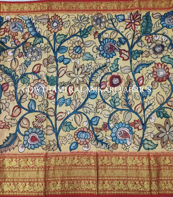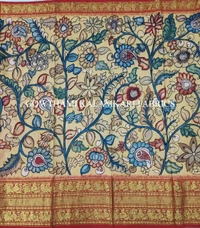 THE REAL FLORAL HAND PAINTED PEN KALAMKARI WITH KANCHI BORDER PURE PATTU DOUBLE WARP LEHENGA.