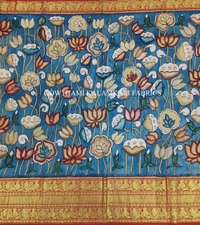 THE REAL FLORAL HAND PAINTED PEN KALAMKARI WITH KANCHI BORDER PURE PATTU DOUBLE WARP LEHENGA.