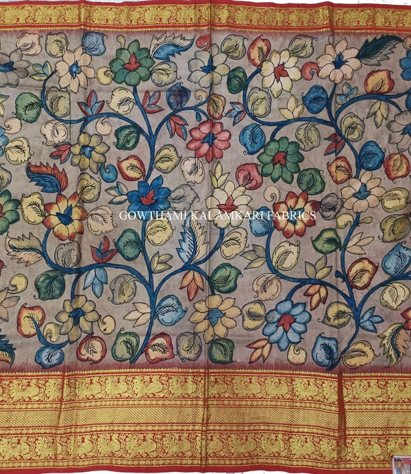 THE REAL FLORAL HAND PAINTED PEN KALAMKARI WITH KANCHI BORDER PURE PATTU DOUBLE WARP LEHENGA.