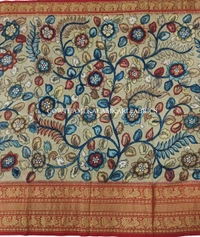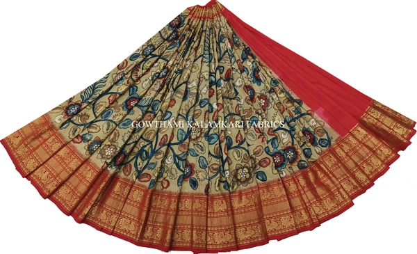 THE REAL FLORAL HAND PAINTED PEN KALAMKARI WITH KANCHI BORDER PURE PATTU DOUBLE WARP LEHENGA.