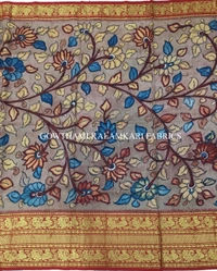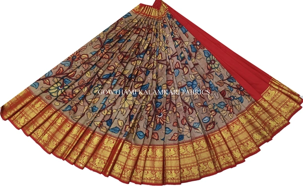 THE REAL FLORAL HAND PAINTED PEN KALAMKARI WITH KANCHI BORDER PURE PATTU DOUBLE WARP LEHENGA.