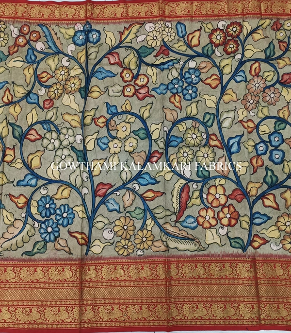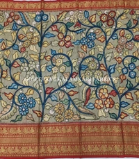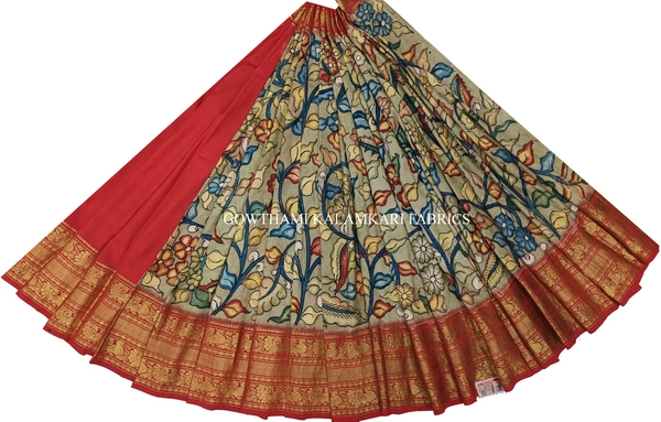 THE REAL FLORAL HAND PAINTED PEN KALAMKARI WITH KANCHI BORDER PURE PATTU DOUBLE WARP LEHENGA.