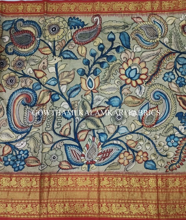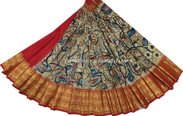THE REAL FLORAL HAND PAINTED PEN KALAMKARI WITH KANCHI BORDER PURE PATTU DOUBLE WARP LEHENGA.