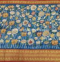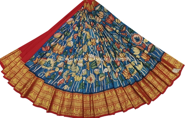 THE REAL FLORAL HAND PAINTED PEN KALAMKARI WITH KANCHI BORDER PURE PATTU DOUBLE WARP LEHENGA.