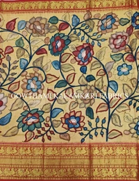 THE REAL FLORAL HAND PAINTED PEN KALAMKARI WITH KANCHI BORDER PURE PATTU DOUBLE WARP LEHENGA.
