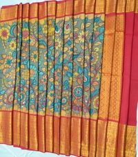 THE REAL FLORAL HAND PAINTED PEN KALAMKARI with PURE PATTU SILK DOUBLE WARP PATTU Sarees with Long KORVAI Border,An Authentic Rich Zari Hand Woven Pallu