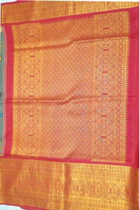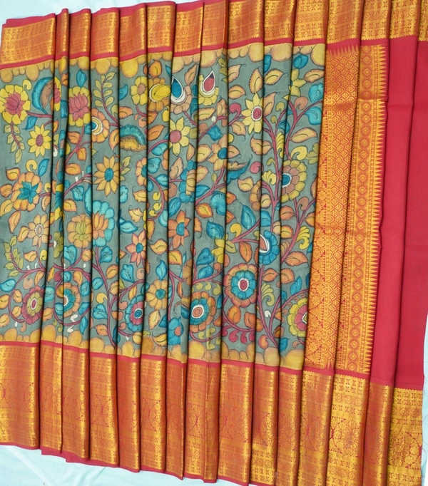 KALAMKARI HAND PAINTED KANCHI BIG BORDER FLORAL SAREE -KHPKBBFS025