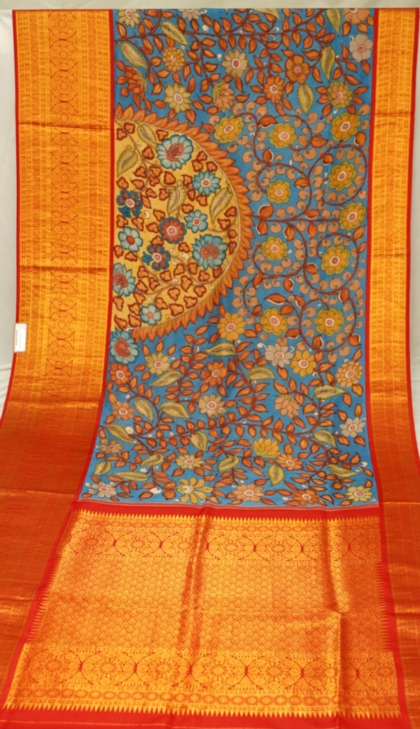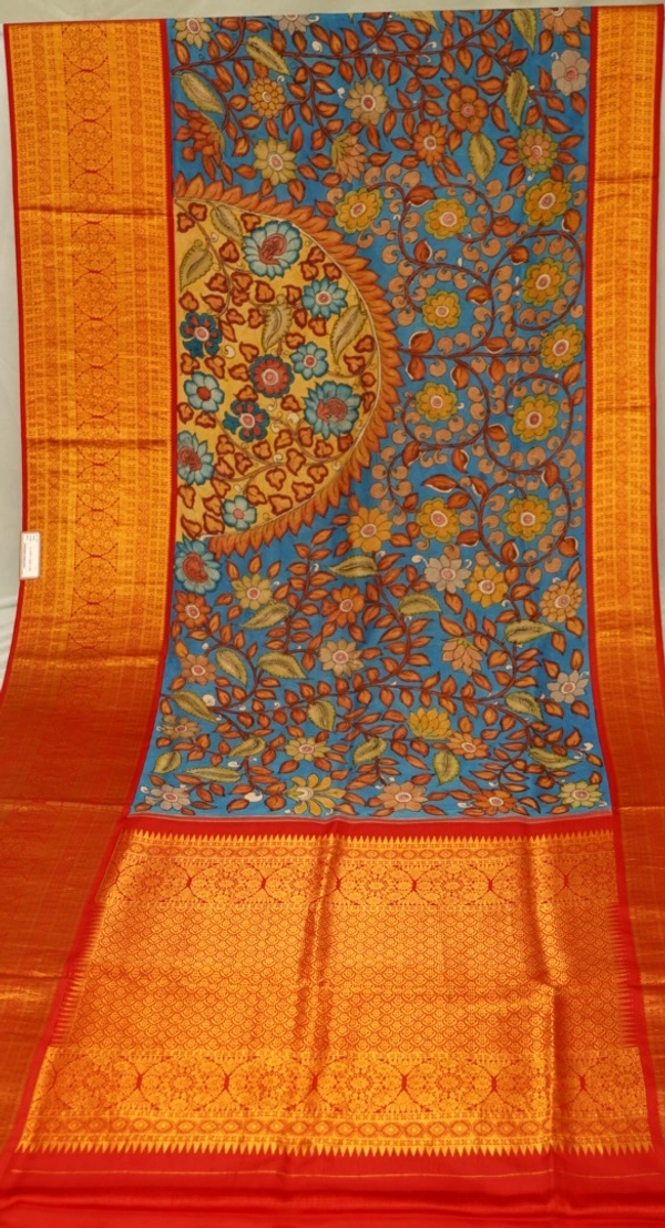 KALAMKARI HAND PAINTED KANCHI BIG BORDER FLORAL SAREE -KHPPPKBBFS010