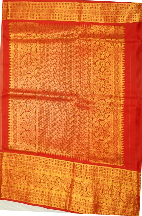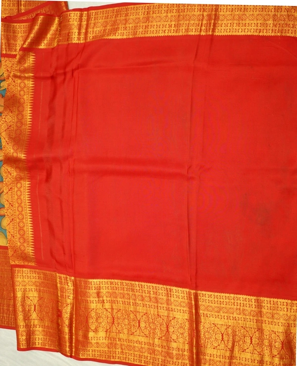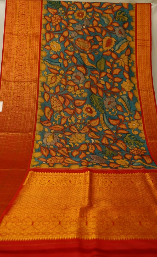 KALAMKARI HAND PAINTED KANCHI BIG BORDER FLORAL SAREE -KHPPPKBBFS013