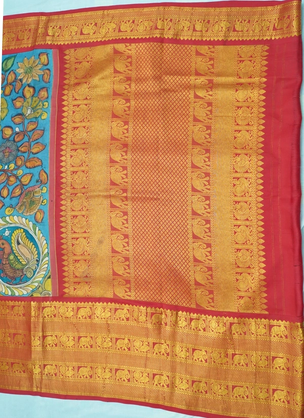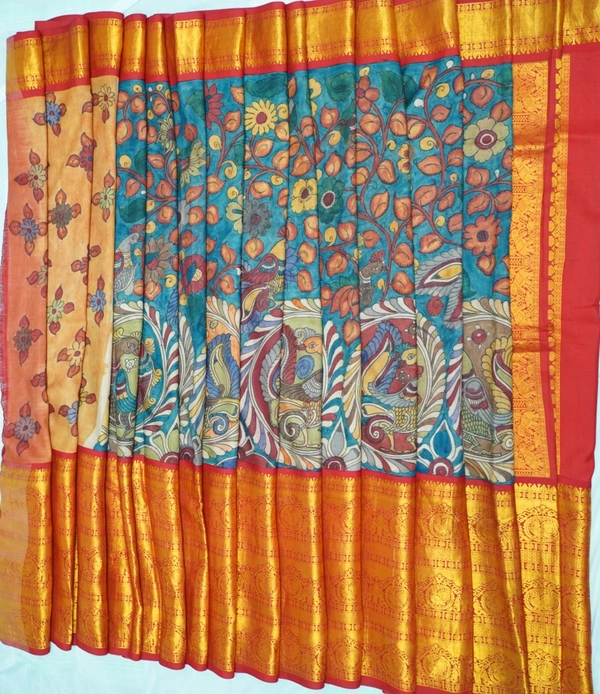 THE REAL FLORAL HAND PAINTED PEN KALAMKARI with PURE PATTU SILK DOUBLE WARP PATTU Sarees with Long KORVAI Border,An Authentic Rich Zari Hand Woven Pallu