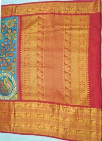 KALAMKARI HAND PAINTED KANCHI BIG BORDER FLORAL SAREE -KHPPPKBBFS018