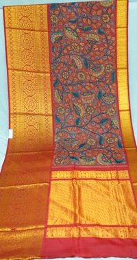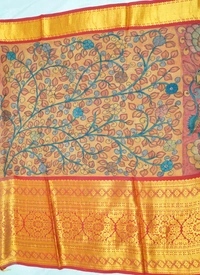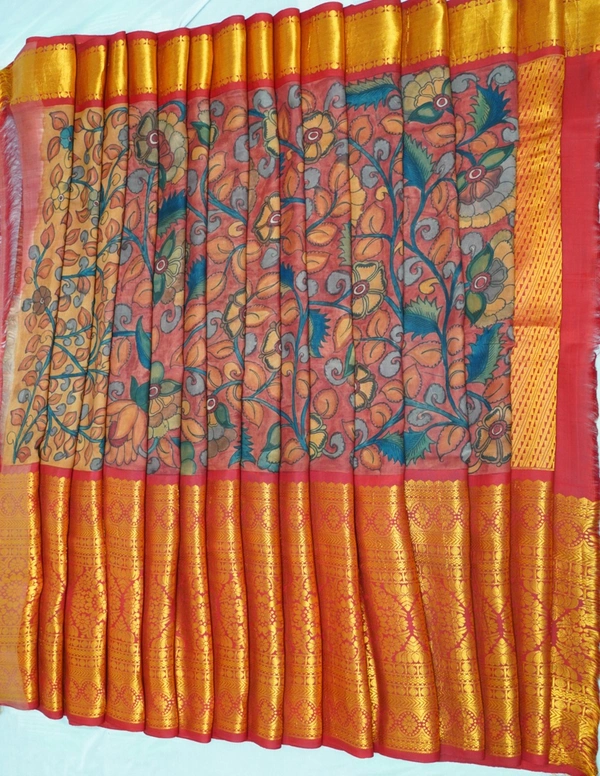 THE REAL FLORAL HAND PAINTED PEN KALAMKARI with PURE PATTU SILK DOUBLE WARP PATTU Sarees with Long KORVAI Border,An Authentic Rich Zari Hand Woven Pallu