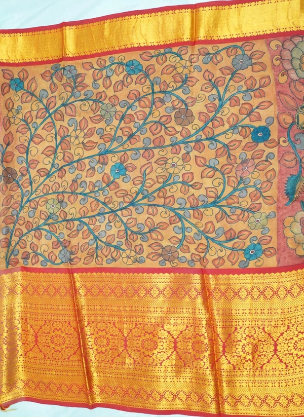 KALAMKARI HAND PAINTED KANCHI BIG BORDER FLORAL SAREE -KHPPPKBBFS020