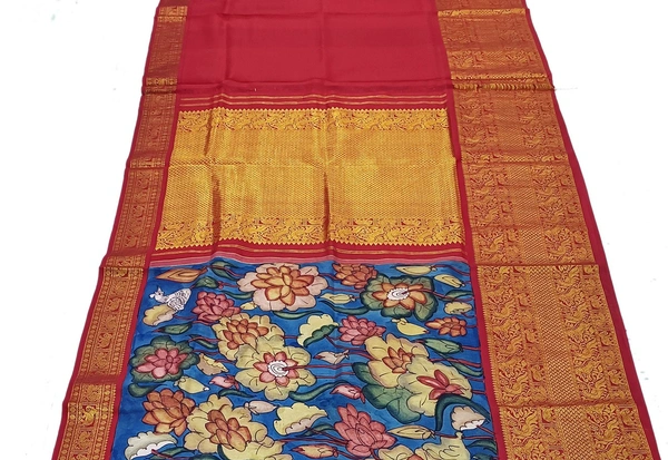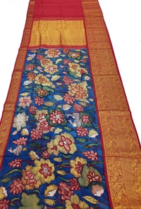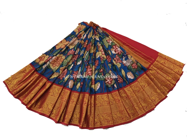 KALAMKARI HAND PAINTED KANCHI BIG BORDER FLORAL SAREES -KHPPPKBBFS001