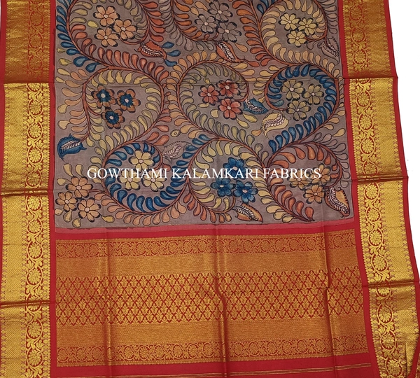 THE REAL FLORAL  HAND PAINTED PEN KALAMKARI WITH KANCHI BORDER DUPATTA