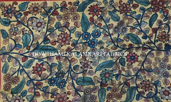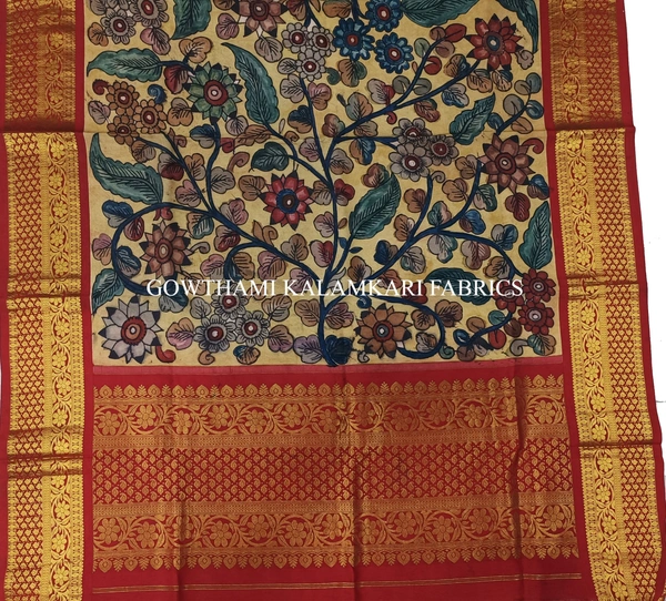 THE REAL FLORAL  HAND PAINTED PEN KALAMKARI WITH KANCHI BORDER DUPATTA