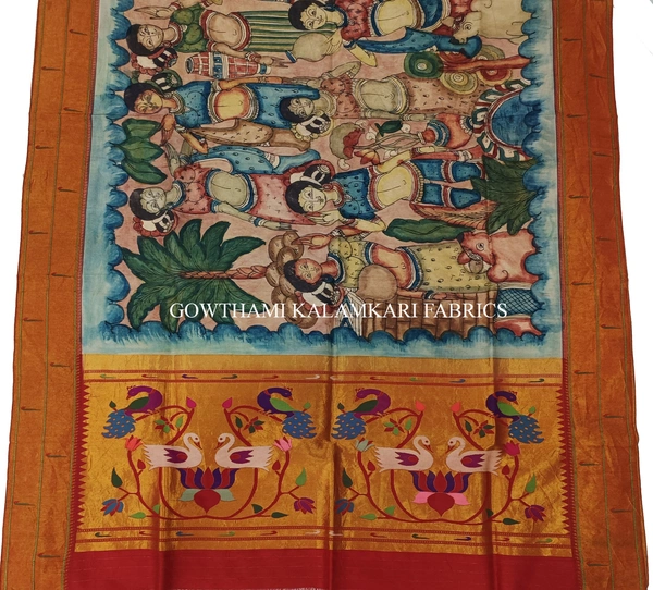 AN INCREDIBLE DESIGN FOR TRADITIONAL WORKTHE REAL FIGURE WORK HAND PAINTED PEN KALAMKARI WITH PAITHANI BORDER DUPATTA