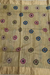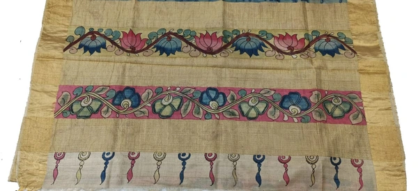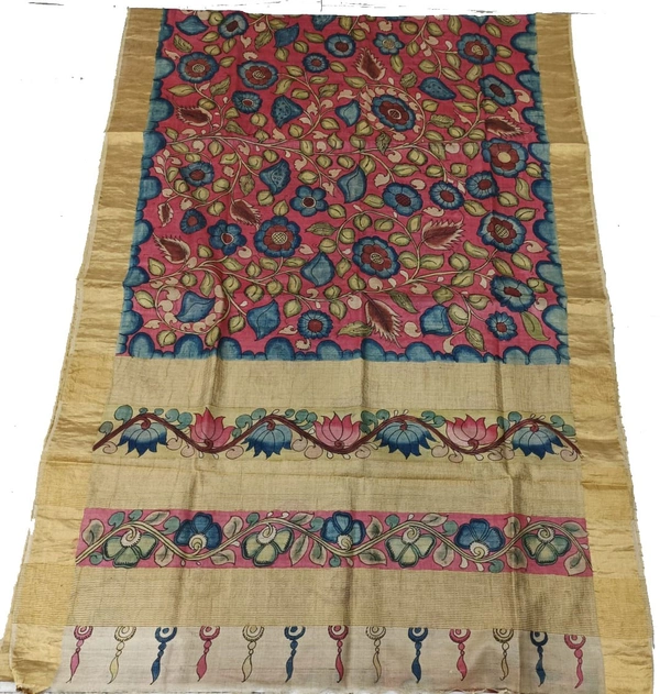 AN INCREDIBLE DESIGNS OF TRADITIONAL WORK“THE REAL FLORAL HAND PAINTED PEN KALAMKARI WITH PURE SILK DOUBLE WARP TUSSAR ”SAREE WITH ZARI KADDI BORDER, AN AUTHENTICZARI LINES PALLU SAREE LENGTH: 5.5MTSSAREE WIDTH:45"-46''CONTRAST BLOUSE(80CMS)