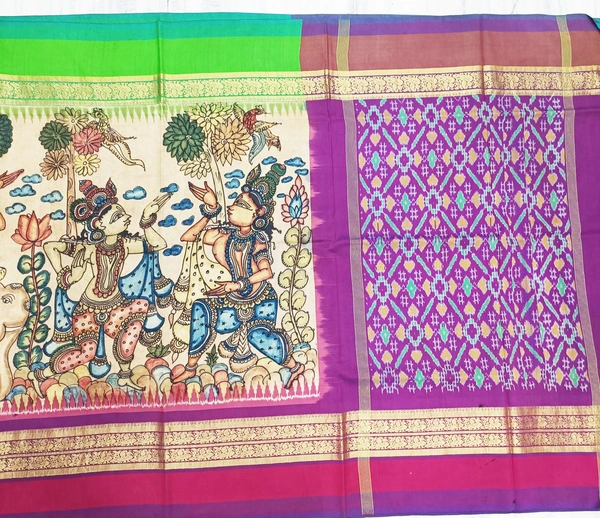 THE REAL FLORAL HAND PAINTED PEN KALAMKARI WITH IKKAT BORDER PURE PATTU DOUBLE WARP SAREES, AN AUTHENTIC HAND WOVEN IKKAT PALLU