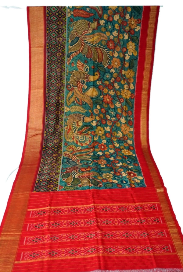 THE REAL FLORAL HAND PAINTED PEN KALAMKARI WITH POCHAMPALLY PURE PATTU SILK IKKAT DOUBLE WARP SAREES, AN AUTHENTIC HAND WOVEN IKKAT PALLU