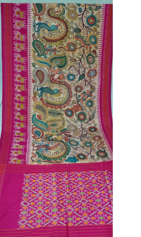 THE REAL FLORAL HAND PAINTED PEN KALAMKARI WITH POCHAMPALLY PURE PATTU SILK IKKAT DOUBLE WARP SAREES, AN AUTHENTIC HAND WOVEN IKKAT PALLU